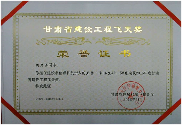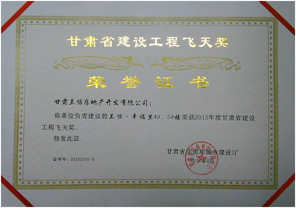 2016年2月5日,由甘肅省住房和城鄉建設廳評選的2015年度甘肅省建設工程“飛天獎”對社會各界發布,本次共發布41個“飛天獎”項目。其中,由甘肅中集實業集團子公司甘肅蘭怡房地產開發有限公司開發建設的中集·幸福里憑借高品質的開發標準,喜獲甘肅省2015年度建設工程“飛天獎”榮譽稱號,成為蘭州市安寧區唯一獲此殊榮的項目。