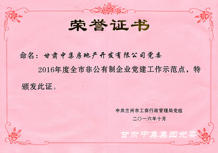 2017年10月10日,由蘭州市工商行政管理局評選的2016年度全市非公有制企業“黨建工作示范點”面向全市發布,甘肅中集房地產開發有限公司黨支部喜獲全市非公有制企業“黨建工作示范點”殊榮并獲得由蘭州市非公委補貼黨建專項經費20000元。