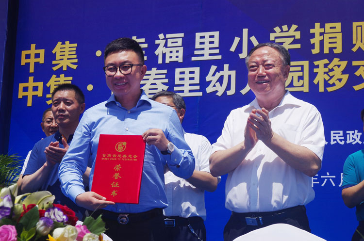 甘肅省慈善總會朱志良會長向甘肅中集實業(yè)集團(tuán)有限公司董事長周啟濤頒發(fā)榮譽(yù)證書