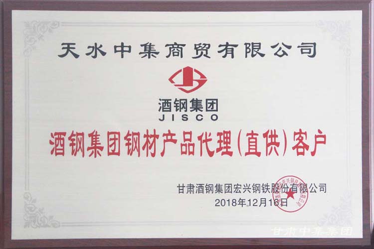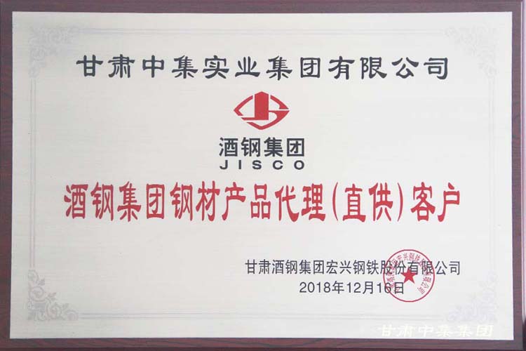 2018年12月12日,由酒鋼集團宏興鋼鐵股份有限公司組織的“2019年酒鋼碳鋼產品推介暨客戶座談會”及“2018年度全國百家金牌供應商頒獎典禮”在蘭州皇冠假日酒店召開。甘肅中集實業集團有限公司及下屬子公司蘭州中集商貿有限公司、天水中集商貿有限公司榮獲“酒鋼集團鋼鐵產品代理(直供)客戶”及“2018年度金牌代理商”殊榮。