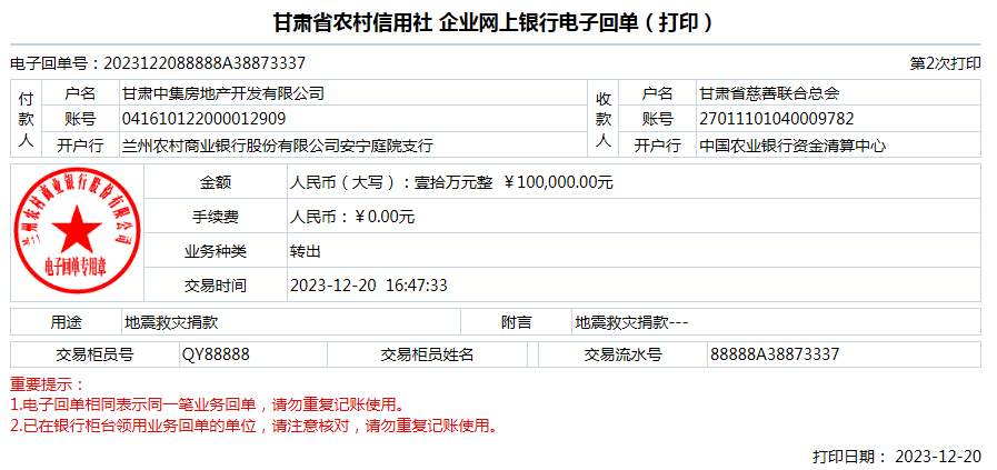 甘肅中集集團向臨夏積石山地震災區捐款10萬元