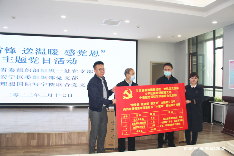 2023年3月17日,甘肅省委組織部組織一處黨支部、安寧區委組織部黨支部、甘肅中集集團黨委聯合開展“學雷鋒 送溫暖 感黨恩”主題黨日活動——向劉家堡街道幸福里社區“小蜜蜂”驛站聯合捐贈價值3萬余元的配套設施。