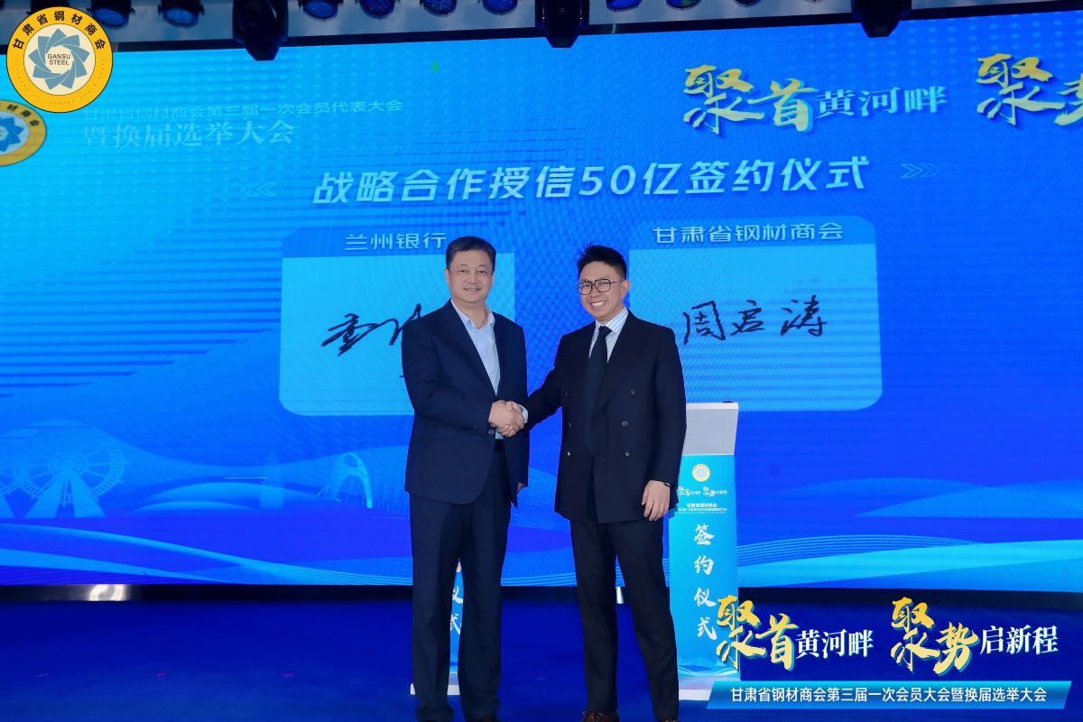 在合作交流環(huán)節(jié),甘肅省鋼材商會分別與甘肅省陜西商會、甘肅省城市建設(shè)商會、甘肅省青年企業(yè)家商會、甘肅省投資商會舉行友好商會簽約儀式,并分別與上海鋼聯(lián)電子商務(wù)有限公司(我的鋼鐵網(wǎng))達(dá)成戰(zhàn)略合作協(xié)議,并與蘭州銀行成功簽訂50億元授信協(xié)議,為甘肅省鋼材商會及會員發(fā)展提供資金、平臺、戰(zhàn)略合作的多方支持。